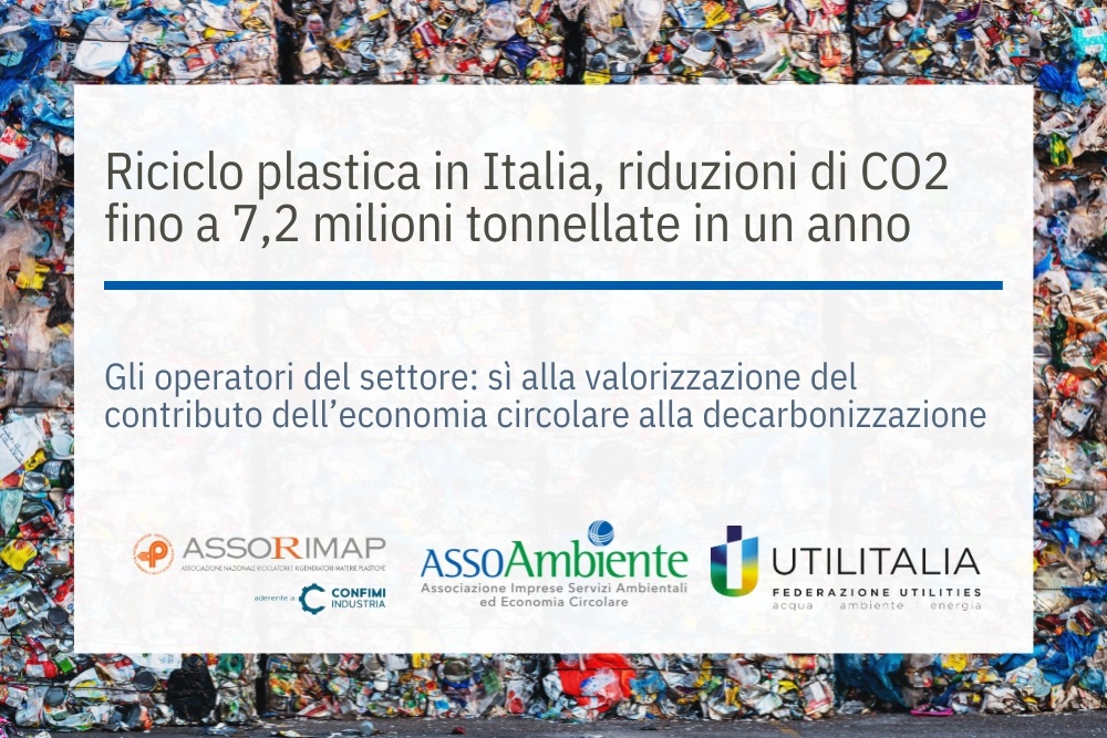 Assorimap, Assoambiente, Utilitalia: Riciclo plastica in Italia, riduzioni di CO2 fino a 7,2 milioni tonnellate in un anno. Sì alla valorizzazione del contributo dell’economia circolare alla decarbonizzazione